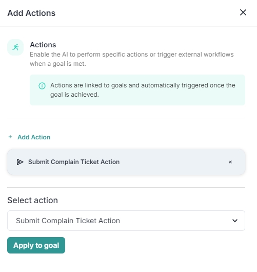 After selecting the action, click Apply to Goal to link it to the procedure’s goal. This ensures the action is automatically executed when the goal is fulfilled.