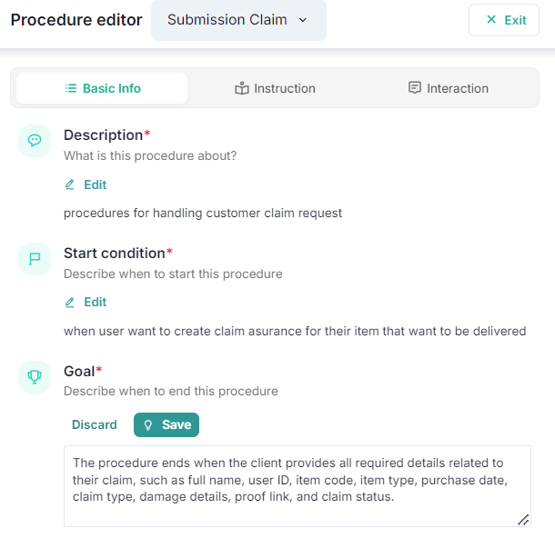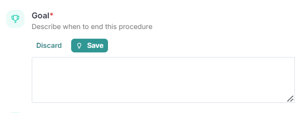 Edit Goal Enter the Goal: Define the condition that indicates the end of the procedure. This is usually based on collecting specific user input or completing a task.