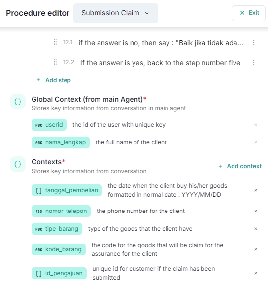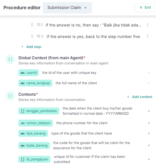 Editing: To change any data in the Global Context, you must edit the main agent. Any updates made here will reflect in all related procedures automatically.