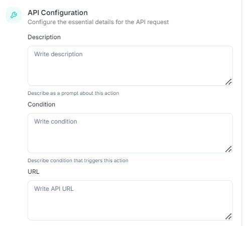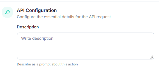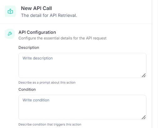 Field Purpose: Here, you describe the conditions or triggers that will cause the API call to be executed. This could be based on user actions, specific events, or data from the conversation.
