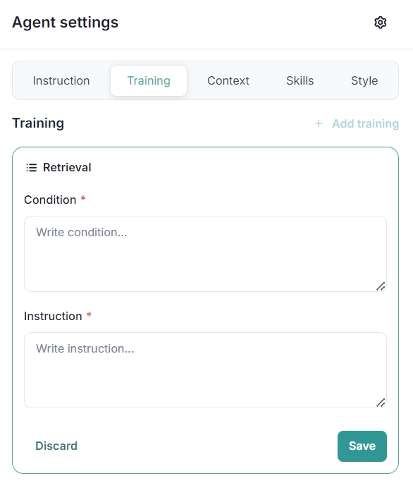Training Retrieval involves teaching the AI agent how to retrieve data effectively based on user inputs. This process links the AI agent's responses to specific skills configured to fetch data from various sources. By setting detailed instructions and conditions, you ensure the AI agent can retrieve and present the correct data efficiently.