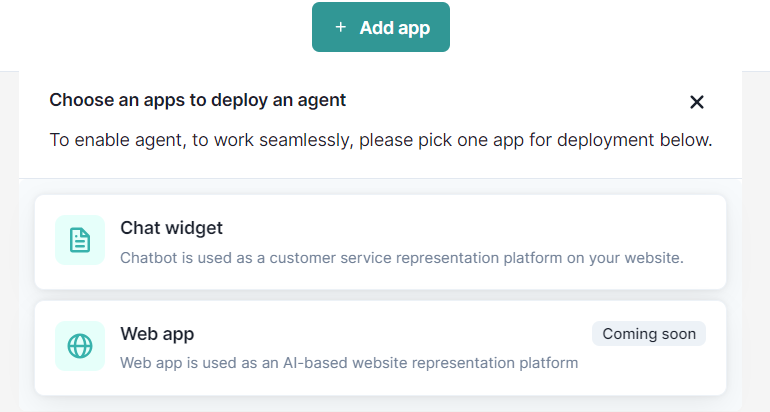 Selecting Deployment Type: Click on the "Add App" button to create a new app. Choose the deployment type (e.g., Chatbot App, Qore Integration, WA App).