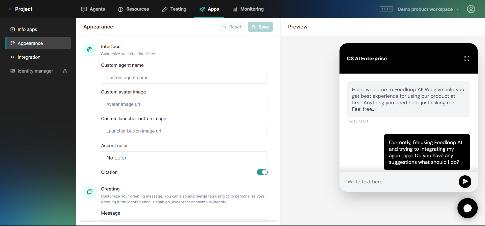 Allows you to personalize the visual identity of your app, making it stand out and aligning it with your brand. You can customize chatbot name,the logo, accent colors, launcher buttons, and more