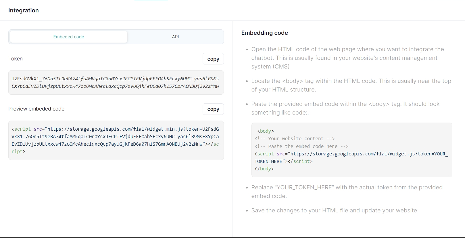 token is a query parameter passed to the JavaScript file for identification and authorization purposes. In this case, it's used to uniquely identify your app or chatbot within the Feedloop AI system.
