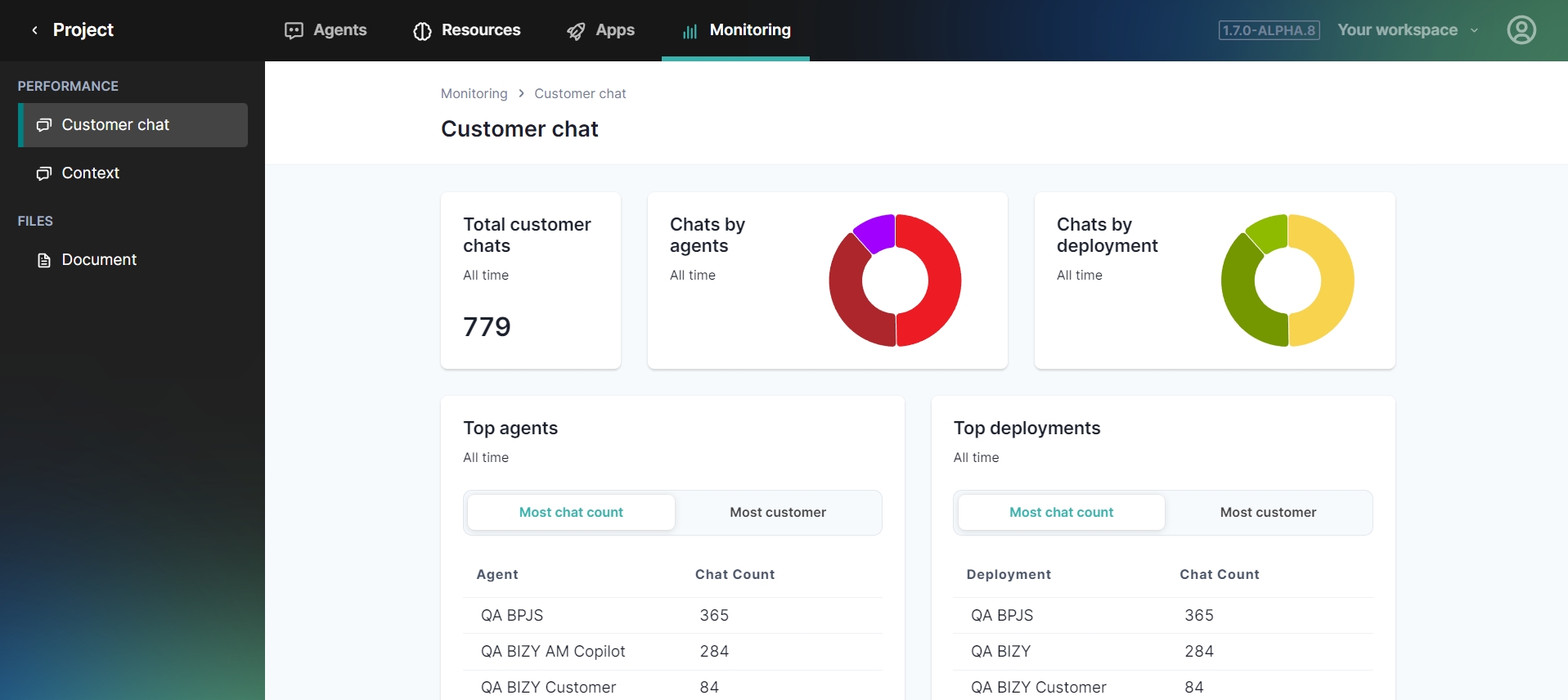 Interactive pie charts and graphs visually represent chat distribution across agents and deployments. Click on segments to access more detailed information.