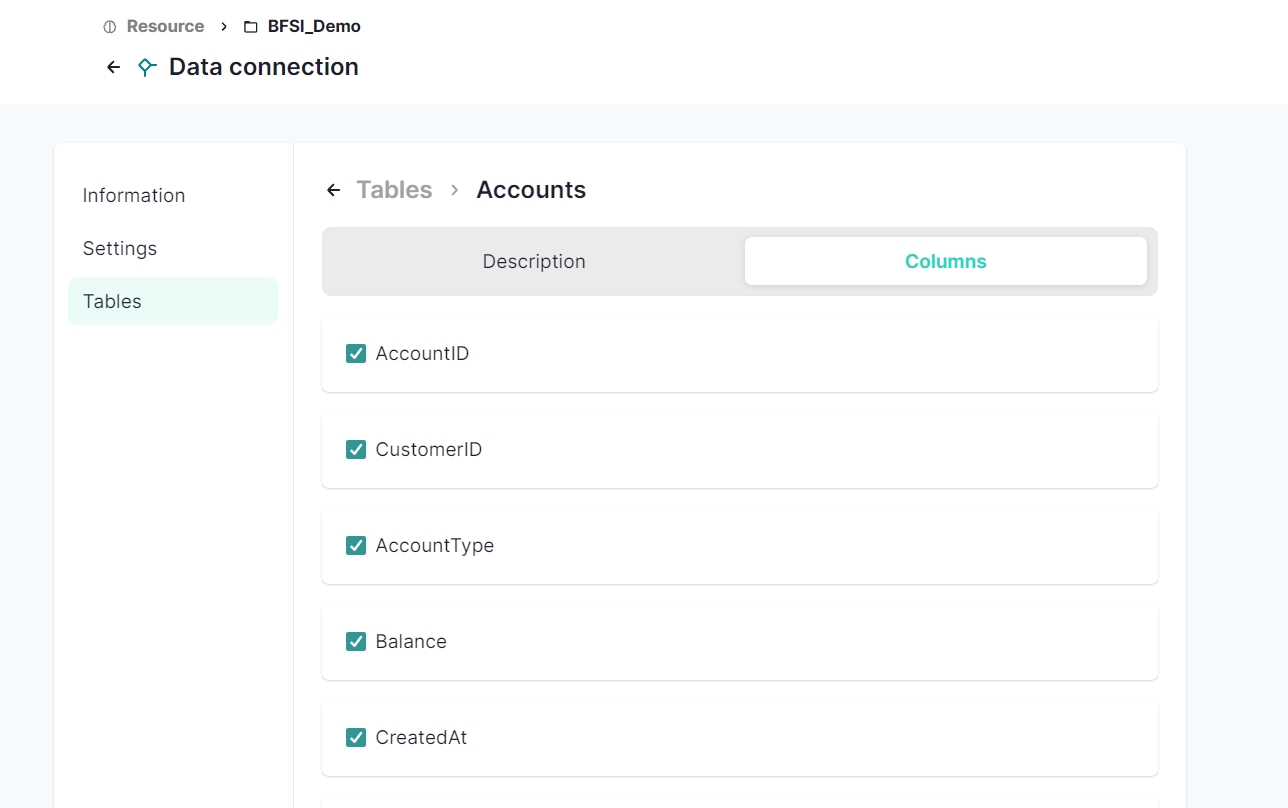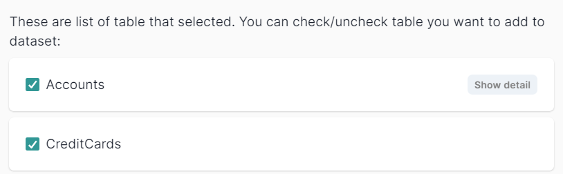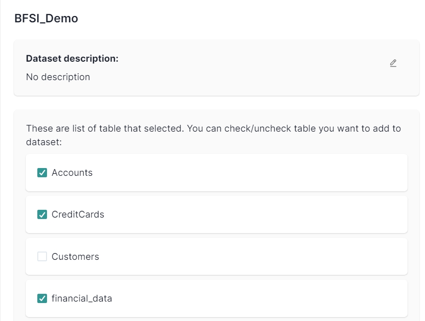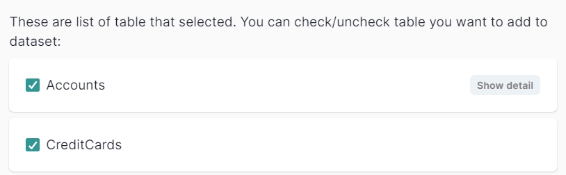 Users can select multiple tables within the connected dataset. For each table, the following information is displayed: