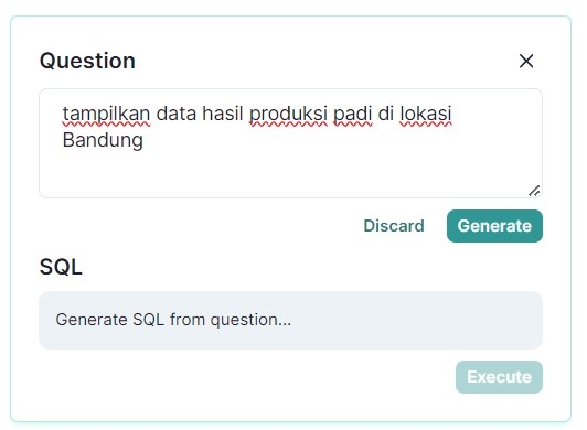"tampilkan data hasil produksi padi di lokasi Bandung"After filling in relevant questions, then press the 'Generate' button to proceed. However, if you wish to delete the questions, you can press the 'Discard' button.