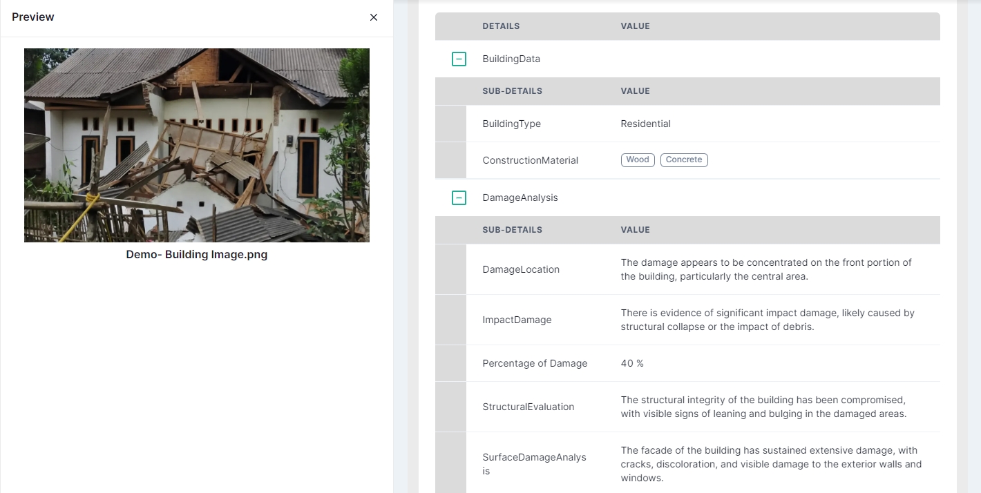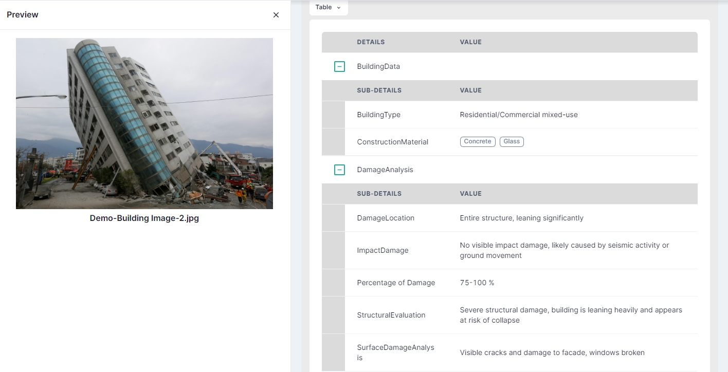 The pre-built Building Analyzer solution automatically processes the uploaded image, identifying the building, detecting any damage, and assessing its severity.