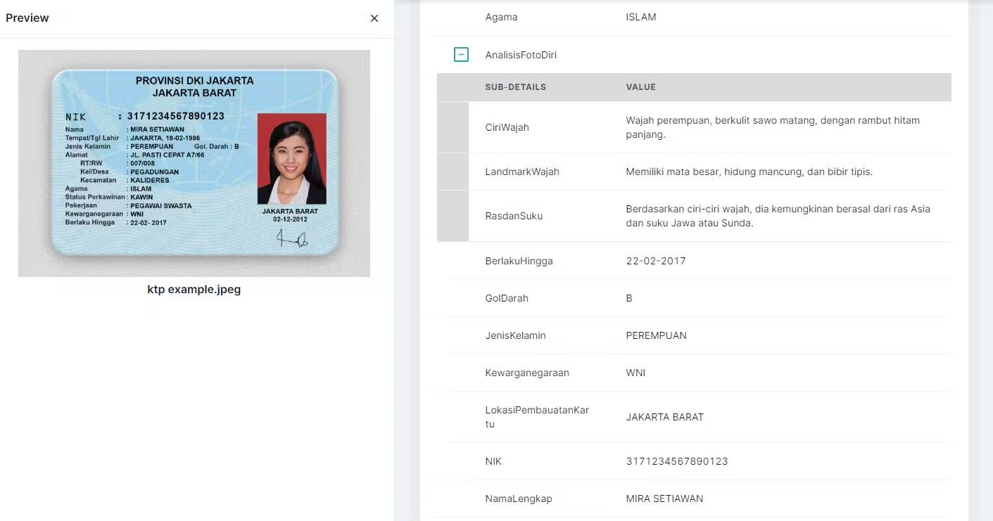 The ID Identifier (KTP) Analyzer solution automatically processes the uploaded image, extracting essential data points and analyzing facial features depicted in the ID photo.