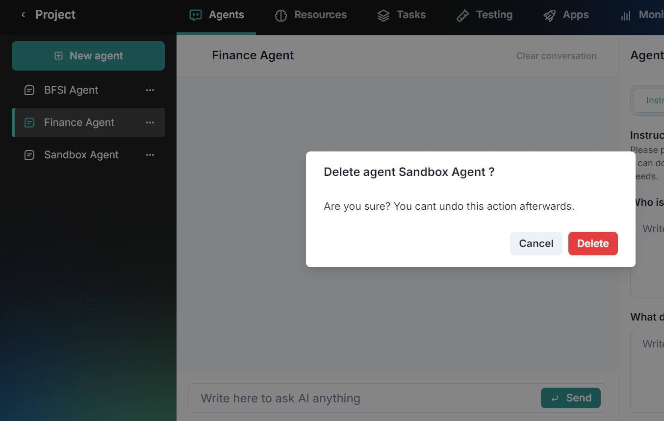 Read the message: "If there is an active agent in the app, you cannot delete the project unless all agents are disabled in the app."